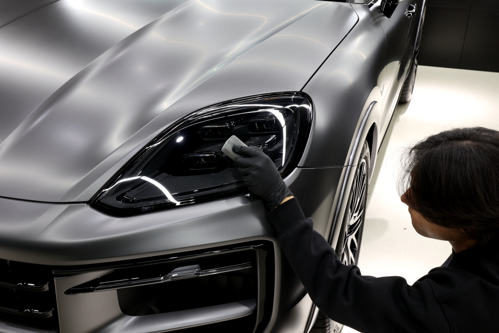 ヘッドライトや透明フィルム施工面も同様に塗り込み・拭き上げを丁寧に行います。